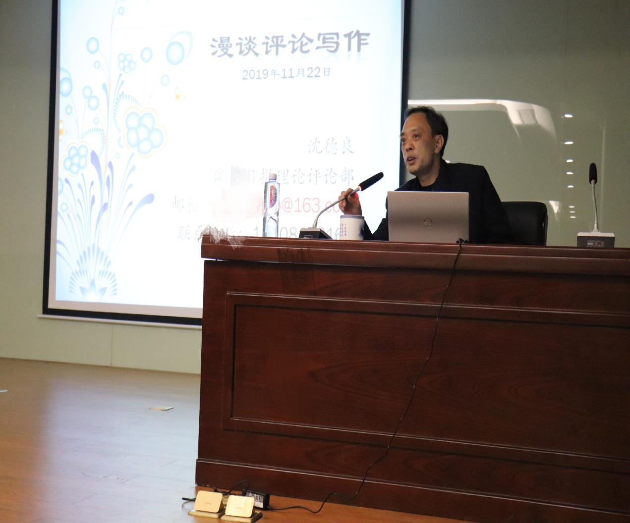 湖南日报社编委兼理论评论中心主任沈德良,也是第29届中国新闻奖新闻评论二等奖获得者。他结合自己从事新闻评论工作多年的经验和最近的工作,为大家分享了评论创作方法、技巧和规范等知识,让大家领略到了新闻评论的思想之美、文字之美。他还给同学们写作新闻评论提出了不少建议,热情鼓励大家关注新闻评论,积极为媒体投稿。